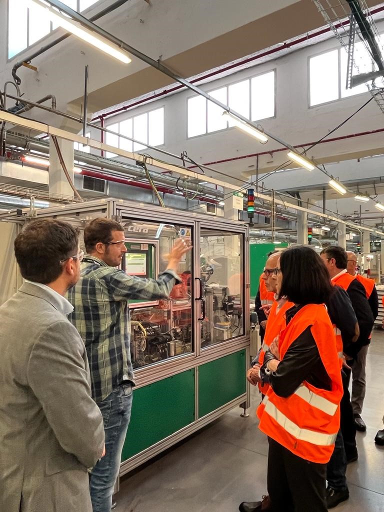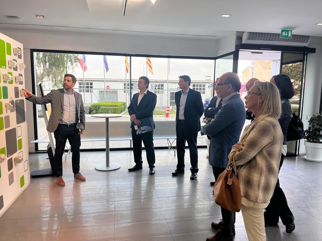 El presidente de FEMEVAL, Vicente Lafuente, junto al vicepresidente tercero, José Luis Beltrán, el vocal por servicios del Comité Ejecutivo, Salvador Monrabal, así como el secretario general, Alejandro Soliveres, la directora de RRHH y RRII, Maite Camps, y Raquel Aliaga, directora de Innovación de VALMETAL, han visitado la planta de Schneider Electric en Meliana.